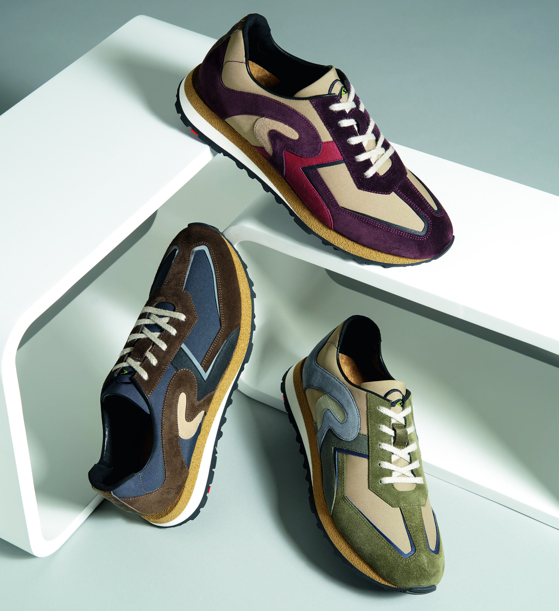 Neu sind auch helle Braun-Sand-Töne und Offwhites, die im Kontrast kombiniert werden – z. B. mit Gummierungen und schwarzen Gummizügen. Weitere Farbakzente erscheinen in Gestalt bunter Sohlen oder Schnürsenkel.