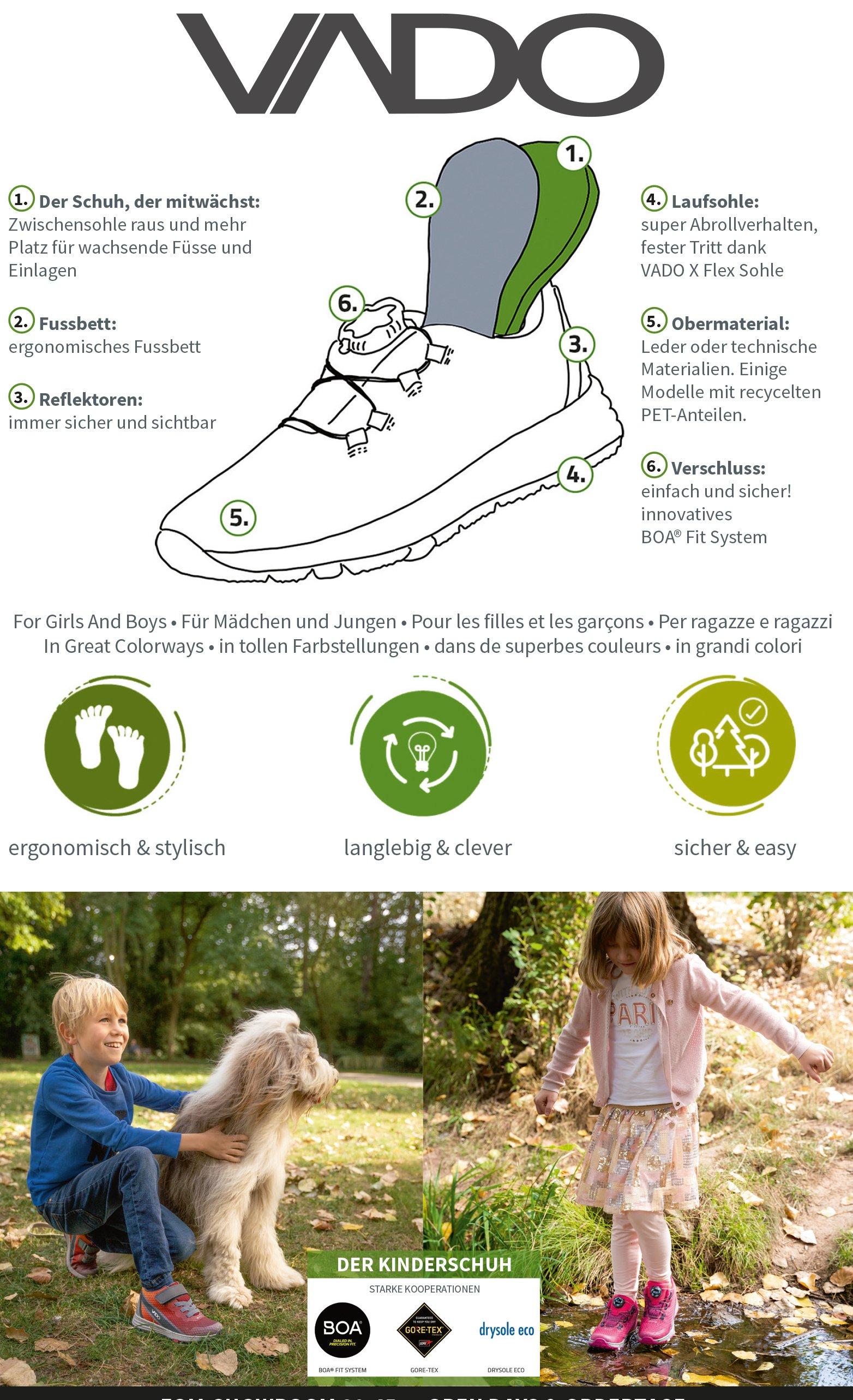 Ein Beispiel ist die Flex-Zone im Profil eines jeden VADO Schuhs. Die ermöglicht optimales Abrollen über den Vorfuß und Ballen mit Druck über den Großzeh. So wird eine gesunde Entwicklung einer so genannten Ganglinie begünstigt. „Lieber enger und dafür länger“ lautet ein weiterer Grundsatz. Enganliegende Schuhe geben sicheren Halt. Dafür darf es etwas länger sein, damit ausreichend Platz für Wachstumsschübe bleibt. Letzteres bedeutet jedoch nicht, dass Schuhe eine Nummer zu groß gekauft werden sollen – was trotzdem häufig geschieht. VADO-Schuhe sind deshalb Schuhe, die mitwachsen. Möglich macht das die zusätzliche Zwischensohle unter dem Fußbett. Diese Funktionseinlage lässt sich einfach herausnehmen. So kann man die Schuhe länger tragen und das bei gleichem Tragekomfort. Ganz nebenbei sind die VADO-Schuhe auch für Orthopädie-Einlagen geeignet.